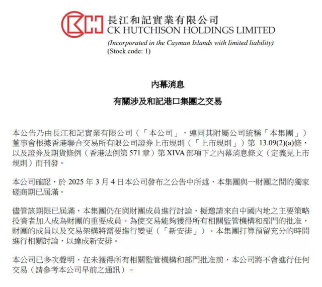 7月28日,长和发布就有关涉及和记港口集团的交易公告。