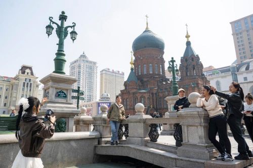 游客在哈尔滨市地标建筑索菲亚教堂附近游玩(2025年4月8日摄)。新华社记者谢剑飞摄