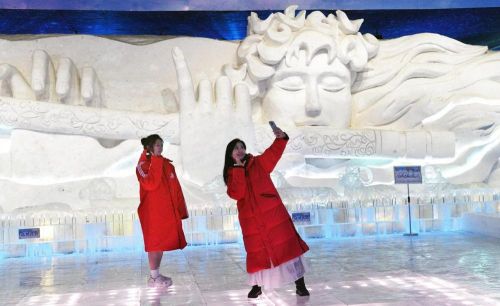 7月9日,在哈尔滨太阳岛冰雪艺术馆,游客在雪雕作品前留影。新华社发(刘洋摄)