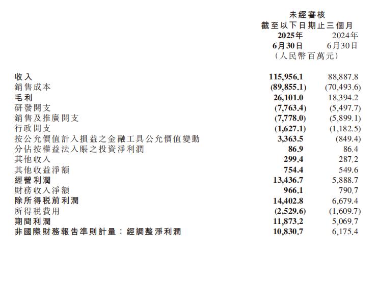 财报还显示,截至2025 年6 月30 日,小米集团有49021名全职雇员,其中研发人员共2641人。薪酬费用总额(包括以股份为基础的薪酬费用)为72亿元,较今年第一季度增加11.0%。