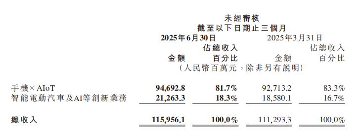 分业务看,第二季度小米集团的手机×AIoT收入为947亿元,同比增长14.8%。其中,智能手机业务收入为455亿元,智能手机出货量为4240万台;智能电动汽车及AI业务收入213亿元。其中,智能电动汽车收入由去年同期的62亿元增加至206亿元,交付量由去年同期的27307辆增加至81302辆,智能电动汽车的ASP上升至每辆253662元。