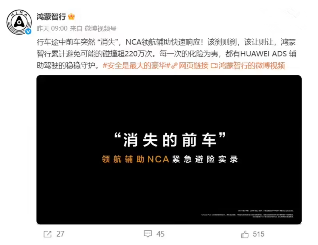 视频中,模拟了行车途中前车突然“消失”的场景,鸿蒙智行搭载的NCA领航辅助系统迅速响应,依据实际路况精准执行制动或避让操作,有效化解潜在风险。鸿蒙智行方面表示,依托先进的智能驾驶技术,其系统已累计避免可能的碰撞超220万次。