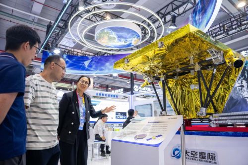 9月24日,第四届北斗规模应用国际峰会在湖南株洲开幕。图为在株洲国际会展中心,工作人员(左三)在介绍一台对地观测卫星。新华社记者 陈思汗 摄