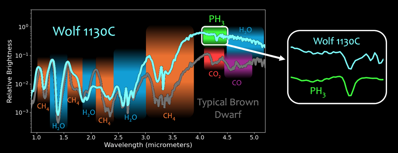 詹姆斯·韦伯太空望远镜对Wolf 1130 C(浅蓝线)和典型褐矮星(灰线)的红外光谱观测对比。彩色波段突出显示了这些光谱中与水、甲烷、二氧化碳、一氧化碳和磷化氢相关的分子吸收特征,其中磷化氢仅出现在Wolf 1130 C 的光谱中。右侧放大的面板突出显示了磷化氢产生的吸收带,该面板比较了Wolf 1130 C(浅蓝线)和纯磷化氢(绿线)的光谱。图片来源:亚当·伯加瑟
