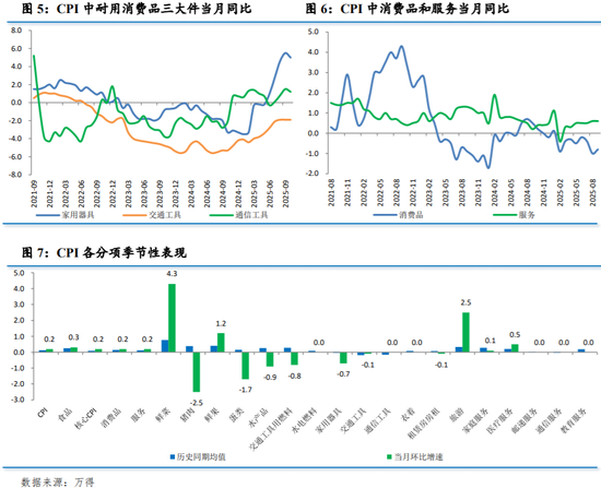工业消费品价格稳中有涨。10月扣除能源的工业消费品价格环比上涨0.3%,影响CPI环比上涨约0.07个百分点;同比上涨2.0%,涨幅连续第6个月扩大。“耐消三大件”中,家用器具环比下跌0.7%,交通工具环比下跌0.1%,通信工具环比涨幅为0,均好于历史同期均值。受国际金价上涨影响,国内金饰品价格环比上涨10.2%,涨幅比上月扩大3.7个百分点。