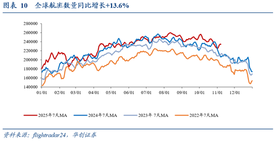 全球航班数量同比增长+13.6%。截至11月7日,全球执行航班数量(7日移动平均)约23.44万架次,同比增长+13.6%。前一周五约为22.56万架次,同比增长-1.2%。