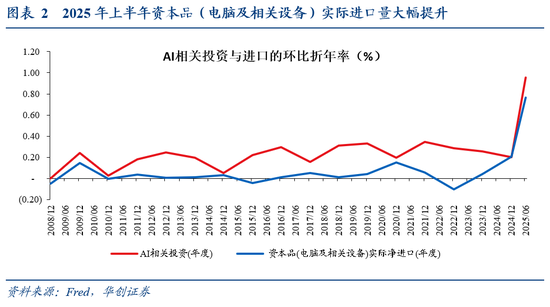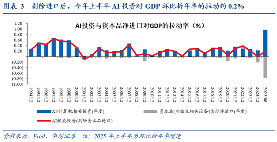 ①AI相关资本品投资来自于进口(例如企业投资建设服务器,但服务器来自于进口),那么企业投资会被记入投资分项,但资本品进口也会被记入进口分项,形成对GDP的减项。可以看到,2025年上半年受到关税带来抢进口的影响,资本品(电脑及相关设备)实际进口量大幅提升。因此我们估算可得,2025年上半年剔除资本品(电脑及相关设备)实际净进口对GDP的负向拉动,则AI相关投资对GDP环比折年率的拉动率为0.2%。