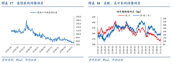 美日、美德的长端国债利差收窄。截至11月7日,美日10年期国债利差为242bp,较前一周收窄2.4bp;美欧10年期国债利差为144bp,较前一周收窄3bp。