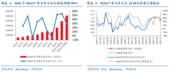 美国AI大厂的资本开支仍有望延续高增,进而带来AI相关投资对GDP的拉动依然很强。2016年以来,美国MAG7公司的资本开支与GDP中AI相关投资的走势一致性较高(注:考虑到企业的资本开支计划也包含了进口,此处的AI相关投资未剔除净进口)。2025-2026年MAG7公司的资本开支预期仍高,同比增速为54%、30%(2024年为51%)。根据MAG7公司的资本开支预期,估算可得:2025、2026年AI相关投资年同比达10%、9%,对GDP的年度拉动率约0.5、0.4个百分点(2024年为0.4%),对经济增长的拉动仍可期待。不过考虑到2025年上半年AI相关投资净进口占AI相关投资总量的比例约21%,按这一比例线性外推,则2025、2026年AI相关投资(剔除净进口)对GDP的年度拉动率或约在0.1%、0.3%。