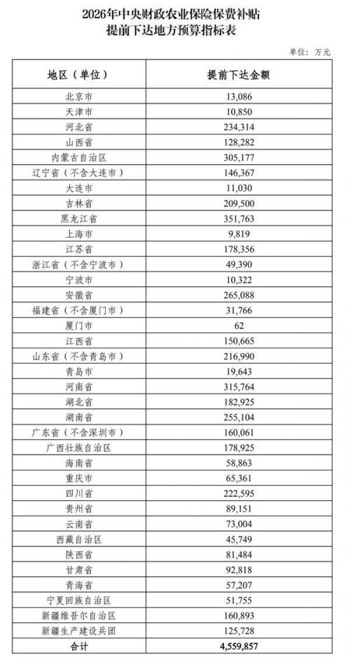 为支持农业保险发展,更好服务保障国家粮食安全,财政部发布通知,提前下达中央财政农业保险保费补贴2026年预算456亿元。