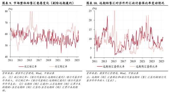 10月份,远期结汇签约额环比减少47亿美元,叠加远期购汇履约额减少37亿美元,使得银行代客远期净结汇累计未到期额增幅由上月150亿降至73亿美元,贡献了银行结售汇顺差规模降幅的17%(见图表7)。当月,市场主体远期结售汇意愿基本稳定,其中远期结汇和购汇套保比率环比分别回落0.4个、回升0.3个百分点至10.6%、3.7%(见图表10)。