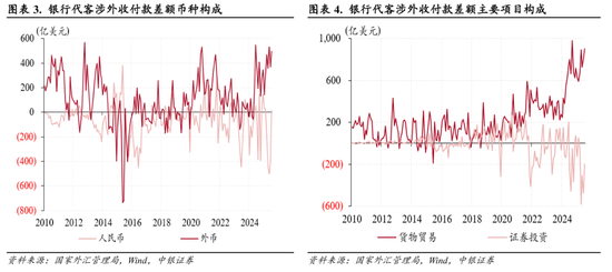 分币种看,人民币涉外收付款时隔四个月重回顺差16亿美元,环比增加414亿美元,外币涉外收付款顺差环比增加128亿至496亿美元,历史排名第五,且为年内次高,二者分别贡献了银行代客涉外收付款顺差增幅的76%、24%(见图表3)。