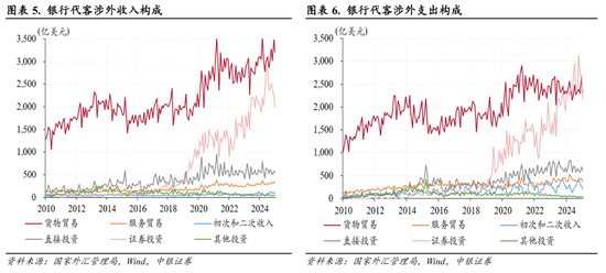 当月,直接投资、收益和经常转移、服务贸易涉外收付款逆差环比分别减少68亿、66亿和55亿美元,均由涉外支出规模季节性回落所致。需要指出的是,服务贸易涉外收付款逆差降至49亿美元,为2023年3月以来新低,即便考虑了上月,近两个月逆差均值为77亿美元,仍然是近三年以来同期新低,表明居民跨境出行需求或有所减少。