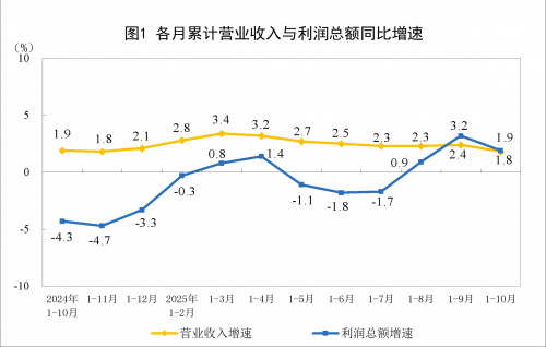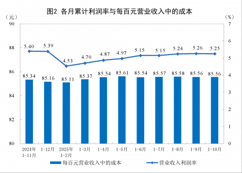 1—10月份,规模以上工业企业实现营业收入113.37万亿元,同比增长1.8%;发生营业成本97.00万亿元,增长2.0%;营业收入利润率为5.25%,同比提高0.01个百分点。