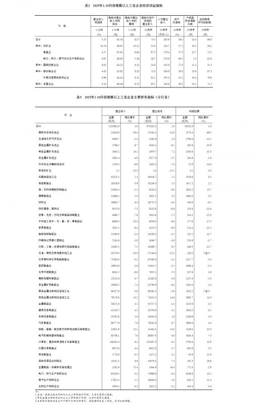 二、规模以上工业企业利润总额、营业收入等指标的增速均按可比口径计算。报告期数据与上年所公布的同指标数据之间有不可比因素,不能直接相比计算增速。其主要原因是:(一)根据统计制度,每年定期对规模以上工业企业调查范围进行调整。每年有部分企业达到规模标准纳入调查范围,也有部分企业因规模变小而退出调查范围,还有新建投产企业、破产、注(吊)销企业等变化。(二)加强统计执法,对统计执法检查中发现的不符合规模以上工业统计要求的企业进行了清理,对相关基数依规进行了修正。(三)加强数据质量管理,剔除跨地区、跨行业重复统计数据。