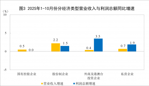 1—10月份,规模以上工业企业中,国有控股企业实现利润总额18490.2亿元,同比持平;股份制企业实现利润总额44328.3亿元,增长1.5%;外商及港澳台投资企业实现利润总额14848.6亿元,增长3.5%;私营企业实现利润总额16995.6亿元,增长1.9%。