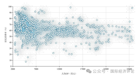 其次,如果暂且不考虑国家和地区之间分化的情况,而是着眼于从最大频数来观察基本趋势的话,我们可以发现随着人均收入的提高,居民消费率近似地呈现为一个横向的S形曲线。具体来说,有这样几个相继的变化。