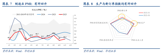 11月制造业PMI为49.2%,前值为49.0%。具体分项来看:1)PMI生产指数为50.0%,前值为49.7%,回升0.3个百分点。2)PMI新订单指数为49.2%,前值为48.8%。PMI新出口订单指数为47.6%,前值为45.9%。3)PMI从业人员指数为48.4%,前值为48.3%。4)供货商配送时间指数为50.1%,前值为50.0%。5)PMI原材料库存指数为47.3%,前值为47.3%。