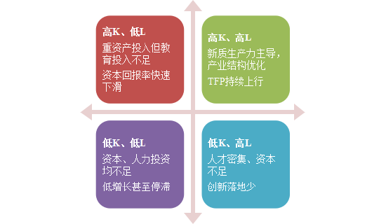 为理解两类投资的关系提供了理论基础。在工业经济时代,A代表全要素生产率(TFP),K代表资本,L代表劳动力。进入数字经济时代,K与L的内涵进一步扩展。K的增长不只是厂房机器与基础设施的简单累积,而是包括制造业升级投资、数字基础设施投入、数据要素配置以及智能化设备等广义资本形态。L的增长也从劳动力规模的线性增加,拓展涵盖至技能水平、健康状况、教育质量、创新能力等多维度。基于此,我们可以构建一个以K和L为轴的四象限框架,用以刻画不同的发展模式。“十五五”期间投资于物和投资于人紧密结合,正是将经济运行从第二象限的“高K低L”模式,迁移至第一象限的“高K高L”新质生产力模式,不仅要追加投入,关键更在于重构投资顺序与配比结构。顺序错配可能导致高杠杆与低效率并存,结构错配可能导致人与物无法形成乘数效应。因此,投资于人、投资于物的核心在于通过政策与市场机制把K和L从加法关系变成乘法关系,以K×L提升全要素生产率。
