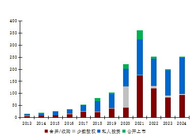图1:2013-2024年按投资活动分类的全球企业对人工智能的投资情况(十亿美元)