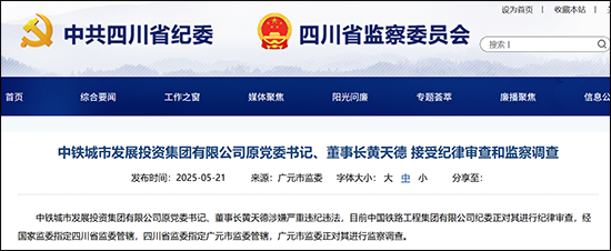 四川省纪委监委网站2025年5月21日消息,中铁城市发展投资集团有限公司原党委书记、董事长黄天德涉嫌严重违纪违法,目前中国铁路工程集团有限公司纪委正对其进行纪律审查,经国家监委指定四川省监委管辖,四川省监委指定广元市监委管辖,广元市监委正对其进行监察调查。
