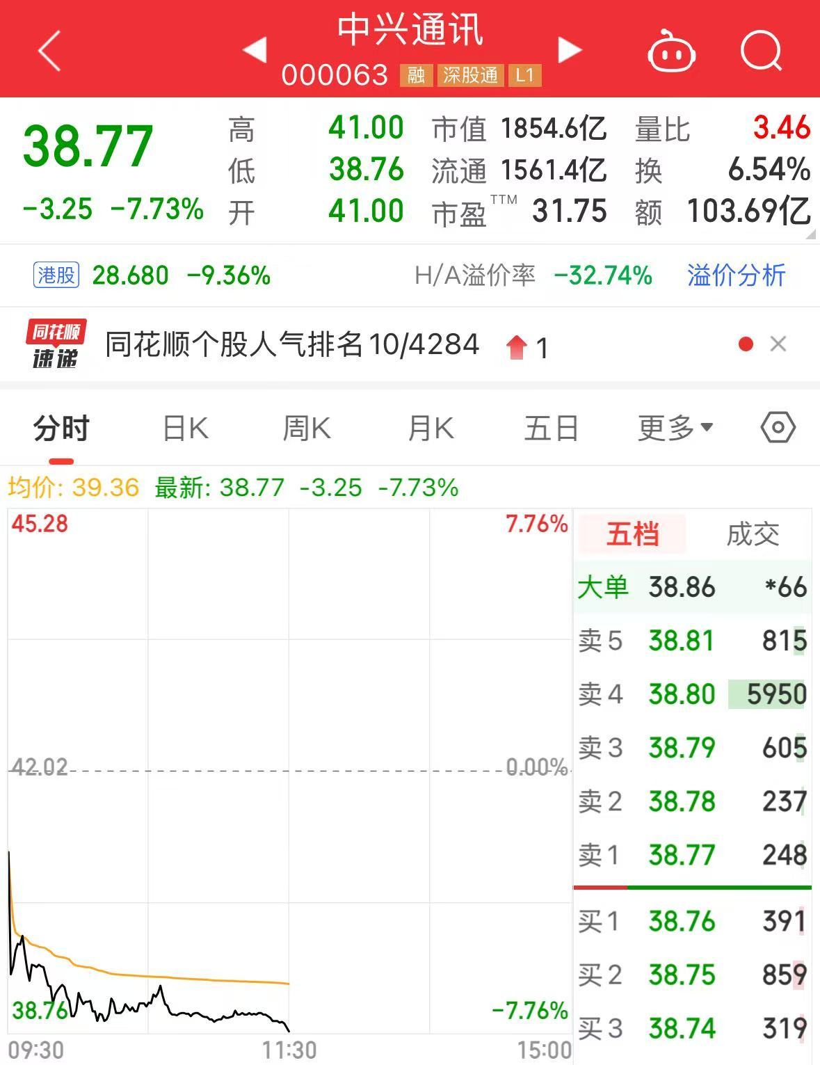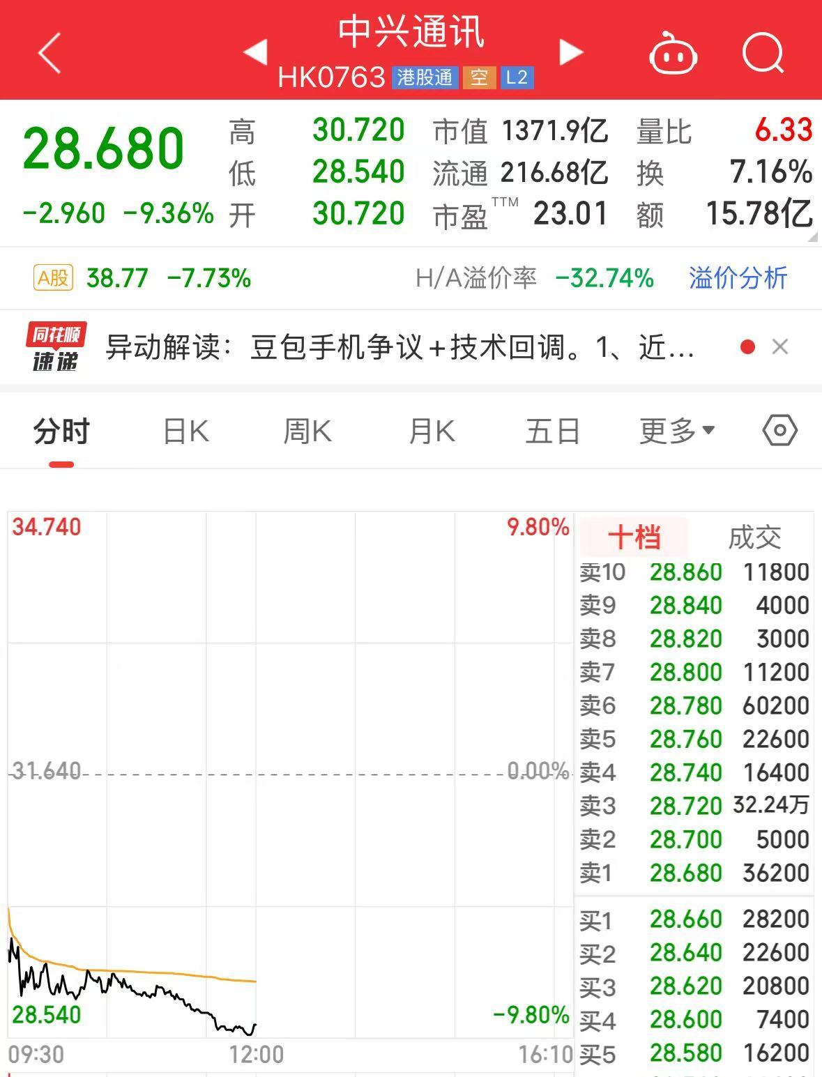 盘面上,中兴通讯今日A股、港股双双大跌。截至A股午间收盘,中兴通讯股价跌7.73%;截至港股午间收盘,中兴通讯股价跌9.36%。