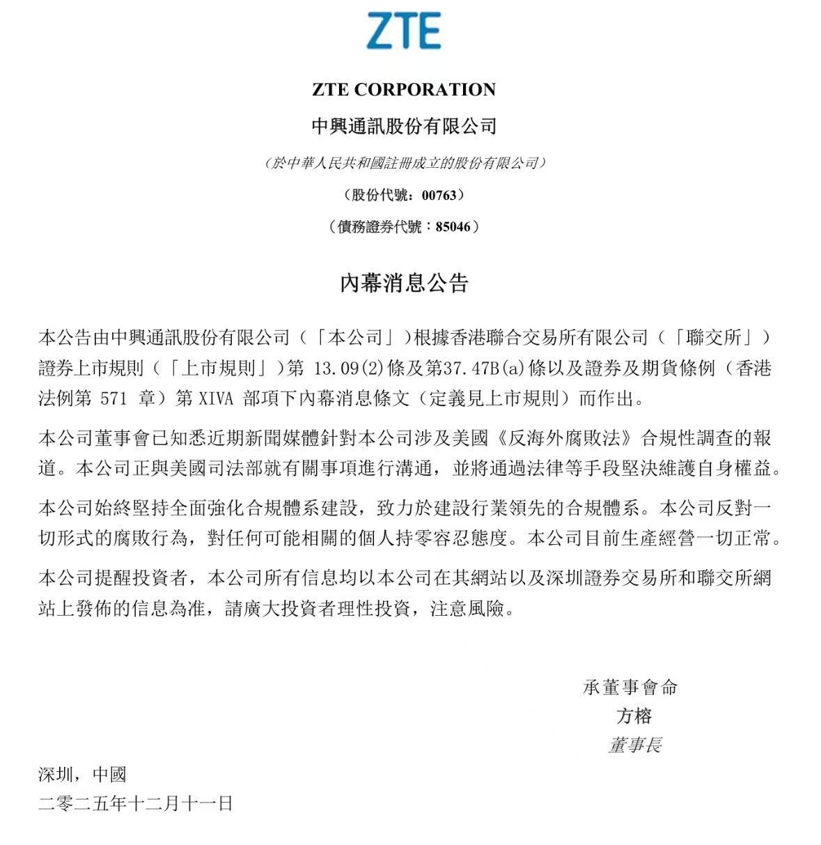 12月11日,中兴通讯(37.820,-4.20,-10.00%)(00763.HK)公告,公司已知悉近期新闻媒体针对本公司涉及美国《反海外腐败法》合规性调查的报道。本公司正与美国司法部就有关事项进行沟通,并将通过法律等手段坚决维护自身权益。本公司始终坚持全面强化合规体系建设,致力于建设行业领先的合规体系。本公司反对一切形式的腐败行为,对任何可能相关的个人持零容忍态度。本公司目前生产经营一切正常。