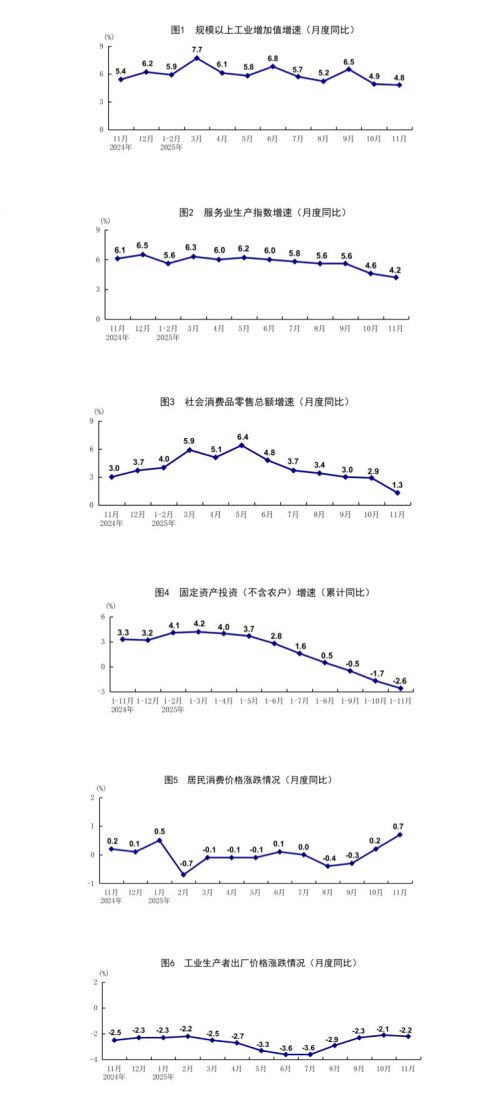 11月份,全国规模以上工业增加值同比增长4.8%,环比增长0.44%。分三大门类看,采矿业增加值同比增长6.3%,制造业增长4.6%,电力、热力、燃气及水生产和供应业增长4.3%。装备制造业增加值同比增长7.7%,高技术制造业增加值增长8.4%,分别快于全部规模以上工业增加值2.9和3.6个百分点。分经济类型看,国有控股企业增加值同比增长4.2%;股份制企业增长5.2%,外商及港澳台投资企业增长3.4%;私营企业增长3.2%。分产品看,3D打印设备、工业机器人、新能源汽车产品产量同比分别增长100.5%、20.6%、17.0%。1-11月份,全国规模以上工业增加值同比增长6.0%。11月份,制造业采购经理指数为49.2%,比上月上升0.2个百分点;企业生产经营活动预期指数为53.1%,上升0.3个百分点。1-10月份,全国规模以上工业企业实现利润总额59503亿元,同比增长1.9%。