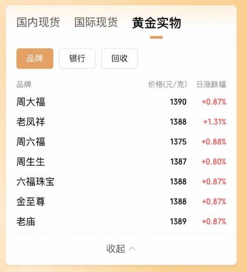 金饰方面,1月6日国内品牌金饰每克单价已再度逼近1400元。其中周大福足金饰品报价1390元/克,老庙足金饰品报价1389元/克,老凤祥、金至尊、六福珠宝足金饰品报价1388元/克,周生生足金饰品报价1387元/克。