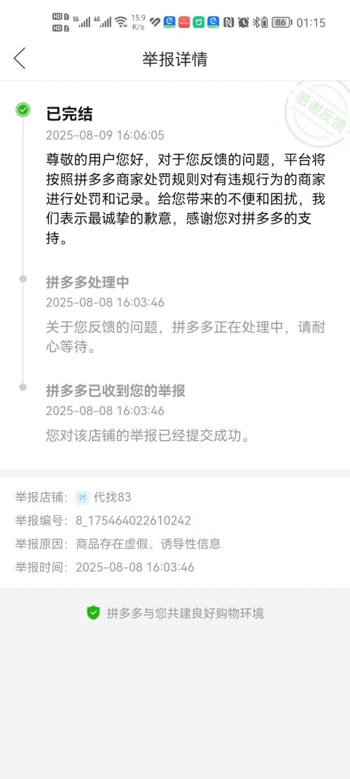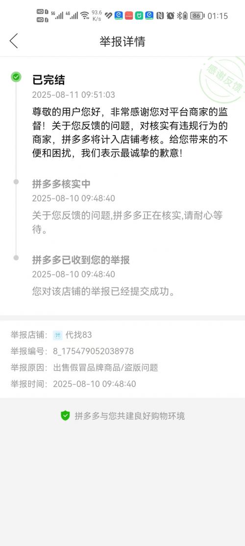 有用户反映,在拼多多平台上遭遇盗版商品后,曾积极向平台客服反馈,希望能得到妥善处理,维护市场的公平与正义。客服起初会抛出掷地有声的承诺:“我们很重视您的反馈,我们对侵权 0 容忍”,可当用户追问具体处理方案时,回应便立刻滑向模糊地带 ——“非常感谢您对平台商家的监督!关于您反馈的问题,对涉及违规行为的商家,拼多多将计入店铺考核”。这种先扬后抑的话术,本质上是用虚假承诺安抚消费者,用模糊处理包庇盗版商家。被举报的盗版商品依旧堂而皇之地陈列在平台上,因为对拼多多来说,下架商品意味着流量流失,处罚商家意味着收益减少,唯有维持现状才能继续享受 “两头吃” 的利益红利。